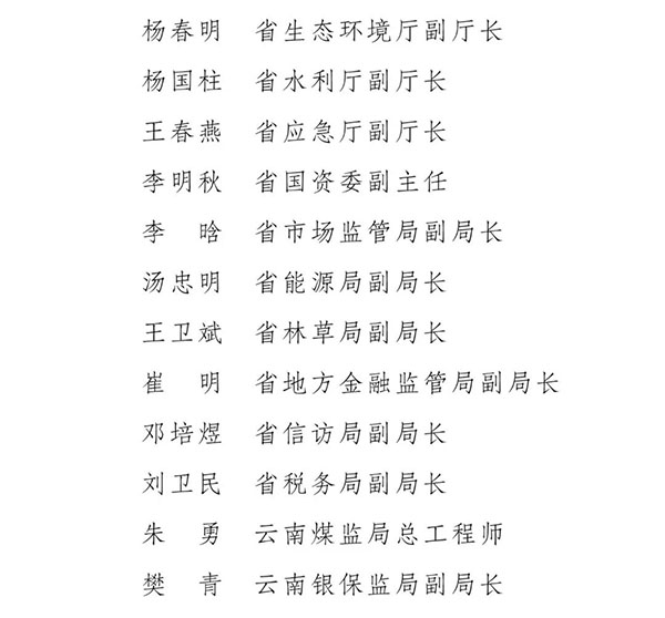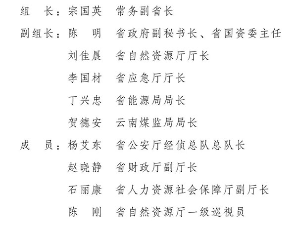 為貫徹落實(shí)全省煤礦安全生產(chǎn)電視電話會(huì)議精神,鐵腕整治煤炭行業(yè),強(qiáng)化煤礦安全生產(chǎn)管理和責(zé)任,堅(jiān)決遏制近期全省煤礦生產(chǎn)安全事故頻發(fā)勢(shì)頭,省人民政府決定成立云南省煤礦整治工作領(lǐng)導(dǎo)小組(以下簡(jiǎn)稱領(lǐng)導(dǎo)小組)?,F(xiàn)將有關(guān)事項(xiàng)通知如下:
