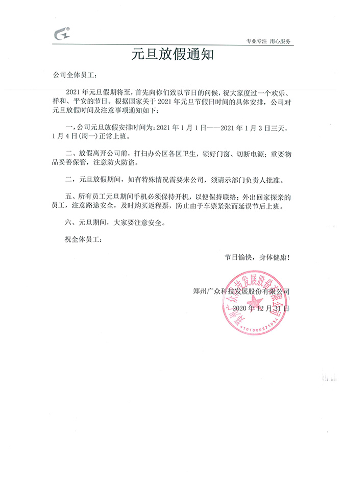 2021年元旦假期將至,首先向你們致以節(jié)日的問候,祝大家度過一個歡樂、祥和、平安的節(jié)日。根據(jù)國家關于2021年元旦節(jié)假日時間的具體安排,公司對元旦放假時間及注意事項通知如下: