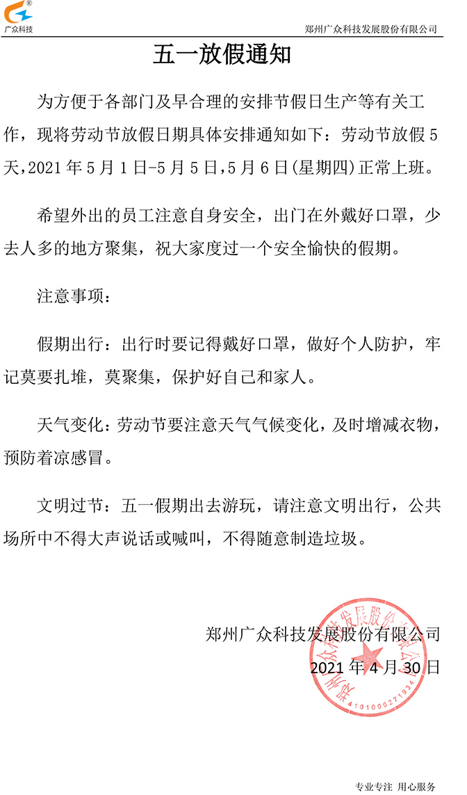 鄭州廣眾科技發(fā)展股份有限公司五一放假通知,期間無人值班,請廣大朋友知悉,有急事的朋友請電話聯(lián)系:17337138705