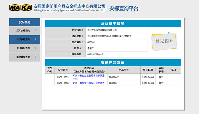 喜訊,鄭州廣眾科技發(fā)展股份有限公司獲得安標(biāo)證書,已經(jīng)可以在國(guó)家安標(biāo)中心官方網(wǎng)站查詢: