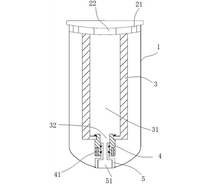 進(jìn)一步地,所述套筒為中空的圓柱形,套筒由下端向上凹設(shè)形成有彈簧槽,彈簧槽供所述彈簧的上段套入。