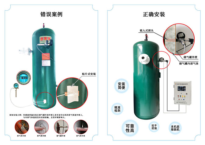 1,儲氣罐打孔不打孔?廣眾科技生產(chǎn)的儲氣罐超溫超壓保護(hù)裝置不打孔,保持原有空壓機(jī)和儲氣罐本身的結(jié)構(gòu)不改變,在儲氣罐安裝壓力表的位置擰下壓力表,采用長三通、短三通來進(jìn)行連接溫度傳感器和壓力傳感器,不影響壓力表的安裝。