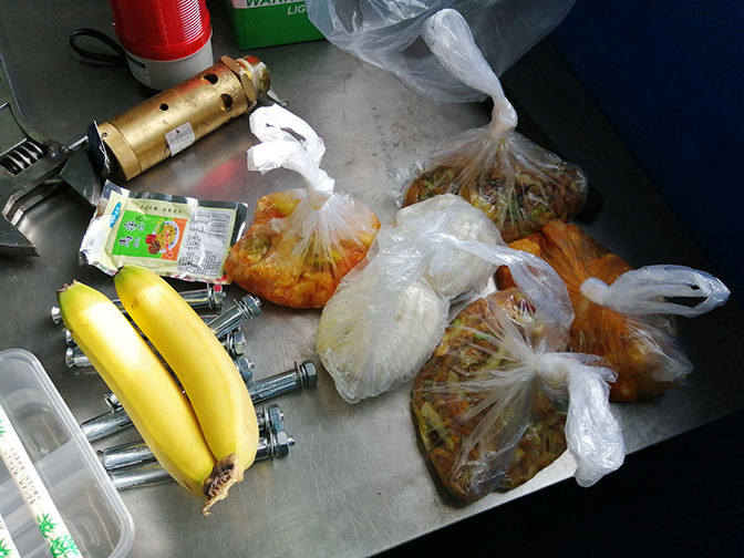 感動送到安裝現(xiàn)場的飯菜,味道很好,還有水果: