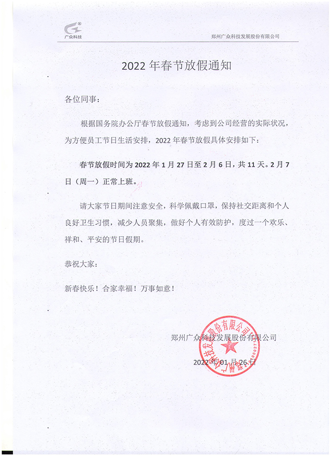 根據(jù)國(guó)務(wù)院辦公廳春節(jié)放假通知,考慮到公司經(jīng)營(yíng)的實(shí)際狀況,為方便員工節(jié)日生活安排,鄭州廣眾科技發(fā)展股份有限公司2022年春節(jié)放假具體安排如下: