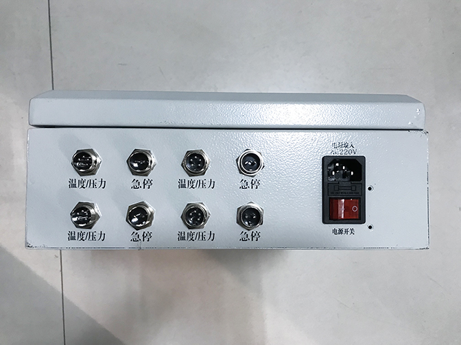 KZB-3型儲(chǔ)氣罐超溫保護(hù)裝置壁掛型為液晶顯示屏,電源、傳感器信號(hào)和控制信號(hào)端口在裝置下側(cè),如下圖,裝置含有4路溫度/壓力測(cè)量輸入接口和4個(gè)空壓機(jī)急停控制接口,每個(gè)儲(chǔ)氣罐的溫度和壓力測(cè)量接口,集成到一個(gè)5芯的航空插頭中,每臺(tái)空壓機(jī)單獨(dú)一個(gè)急停控制接口。如只監(jiān)測(cè)一臺(tái)儲(chǔ)氣罐數(shù)據(jù),只接一組即可,其他接口空余。