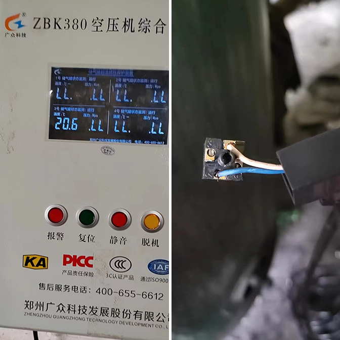 經(jīng)過中間商和我方人員的詳細(xì)溝通,礦方成功安裝了壓力傳感器,ZBK380空壓機(jī)綜合保護(hù)裝置顯示出了儲(chǔ)氣罐的溫度壓力,安裝任務(wù)圓滿完成。