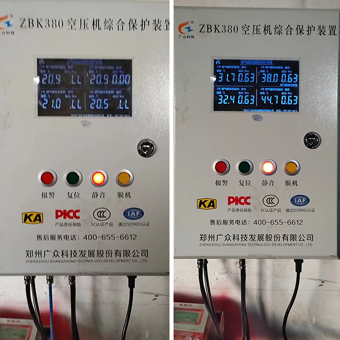 用戶現(xiàn)場有4臺(tái)空壓機(jī)4臺(tái)儲(chǔ)氣罐,每臺(tái)空壓機(jī)連接一臺(tái)儲(chǔ)氣罐,根據(jù)煤安規(guī)程要求和當(dāng)?shù)貦z查需求已經(jīng)實(shí)際需要,需要安裝儲(chǔ)氣罐超溫保護(hù)裝置,經(jīng)過中間商和我們以及礦方的詳細(xì)溝通,礦方購買了鄭州廣眾科技生產(chǎn)的液晶壁掛型名稱為:ZBK380空壓機(jī)綜合保護(hù)裝置的超溫超壓型保護(hù)裝置,對現(xiàn)場的4臺(tái)空壓機(jī)4臺(tái)儲(chǔ)氣罐進(jìn)行保護(hù)。
