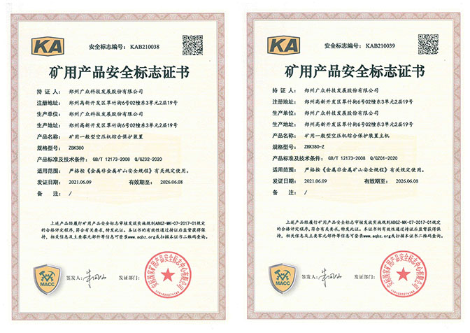 ZBK380空壓機綜合保護裝置安標證,鄭州廣眾科技發(fā)展股份有限公司廠家擁有!