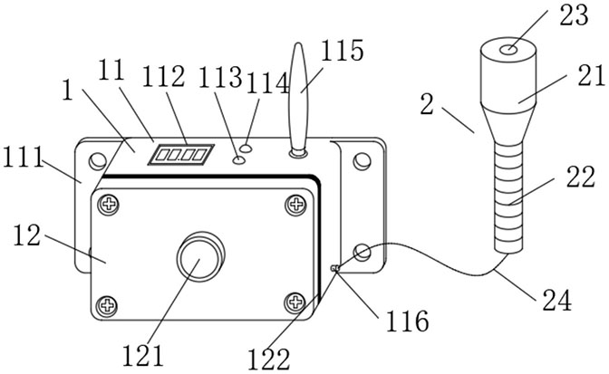 專利摘要:本實(shí)用新型涉及磨機(jī)技術(shù)領(lǐng)域,具體涉及一種磨損量在線監(jiān)測(cè)裝置,包括探頭螺栓與數(shù)據(jù)采集處理裝置。探頭螺栓與數(shù)據(jù)采集處理裝置可拆卸連接,數(shù)據(jù)采集處理裝置兩側(cè)設(shè)有安裝部,通過安裝部安裝在安裝板上,數(shù)據(jù)采集處理裝置中設(shè)置有顯示器,實(shí)現(xiàn)對(duì)磨損量的現(xiàn)場(chǎng)顯示,并設(shè)置有狀態(tài)指示燈,便于作業(yè)人員進(jìn)行把握,同時(shí)設(shè)置有按鈕開關(guān),更加便于作業(yè)人員對(duì)設(shè)備進(jìn)行管理,合理控制設(shè)備工作時(shí)間,提高設(shè)備使用壽命。本實(shí)用新型拆卸安裝簡(jiǎn)便,便于設(shè)備維修,同時(shí)通過在數(shù)據(jù)采集處理裝置中安裝顯示器,能夠在現(xiàn)場(chǎng)對(duì)磨損量進(jìn)行顯示,并設(shè)置指示燈,便于作業(yè)人員把握,同時(shí)還能夠在不必要的時(shí)間讓設(shè)備停止工作,有助于延長設(shè)備的使用壽命。