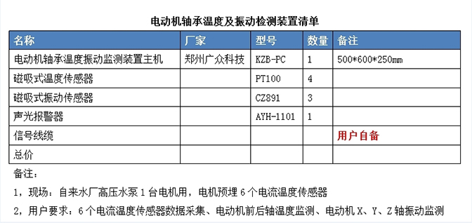 水泵電機(jī)預(yù)埋電流溫度傳感器的采集,電動(dòng)機(jī)X、Y、Z的振動(dòng)監(jiān)測(cè),電動(dòng)機(jī)前后軸溫度監(jiān)測(cè)等。以一臺(tái)電機(jī)為例,此種要求配備清單如下:
