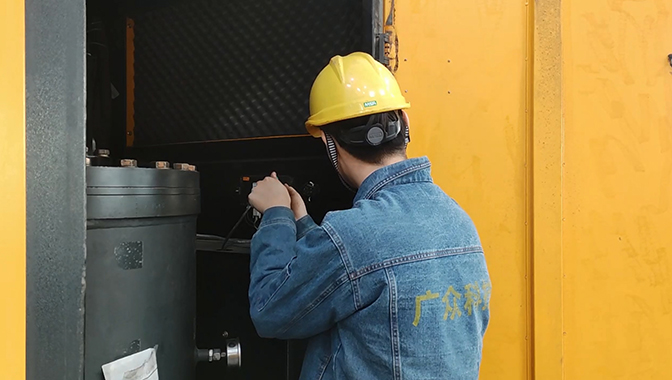 廣眾工程師在現(xiàn)場(chǎng)安裝空壓機(jī)斷油保護(hù)裝置