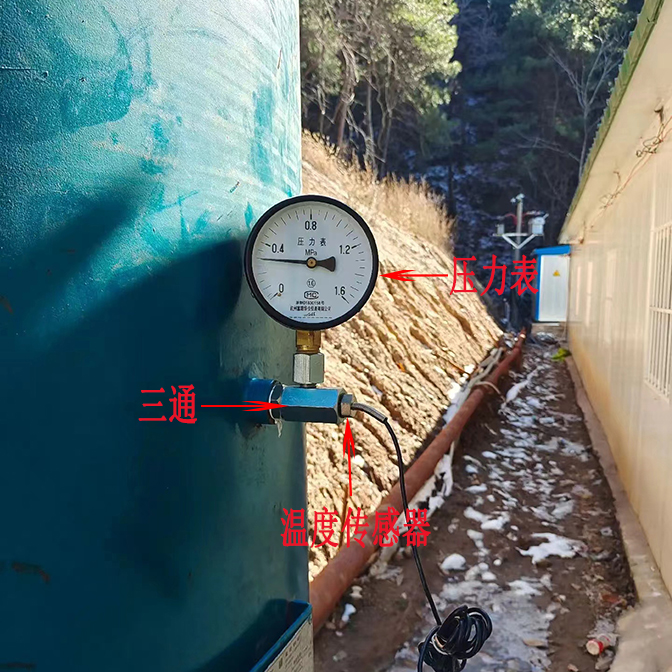 2,長(zhǎng)三通連接到到儲(chǔ)氣罐,溫度傳感器連接到長(zhǎng)三通并固定好,溫度傳感器和三通連接在一起,原來(lái)的壓力表連接在三通上。見下圖: