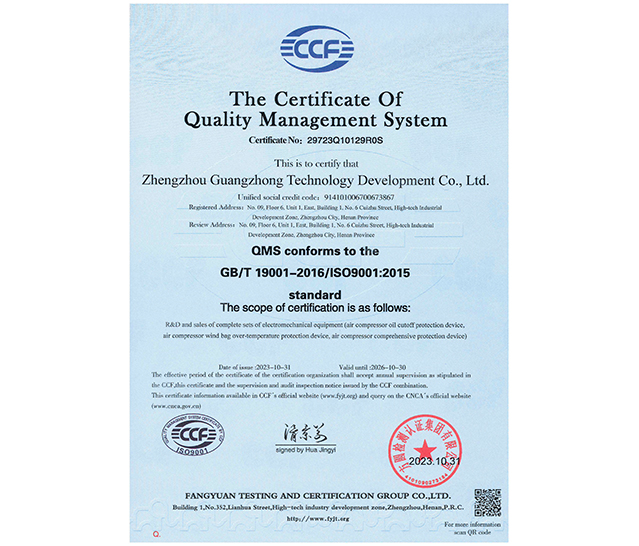 鄭州廣眾科技發(fā)展股份有限公司質(zhì)量管理體系認(rèn)證證書頒發(fā),通過認(rèn)證范圍如下:機(jī)電成套設(shè)備(空壓機(jī)斷油保護(hù)裝置,空壓機(jī)風(fēng)包超溫保護(hù)裝置,空壓機(jī)綜合保護(hù)裝置)。