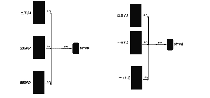 根據(jù)溝通,了解到用戶現(xiàn)場空壓機(jī)和儲氣罐的供氣關(guān)系為:3臺空壓機(jī)供氣1臺儲氣罐的情況2組。